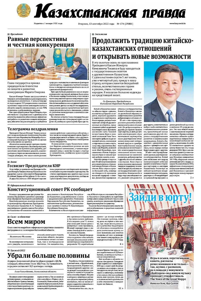 2022年9月13日,国家主席习近平在《哈萨克斯坦真理报》发表题为《推动中哈关系在继往开来中实现更大发展》的署名文章。(图源:《哈萨克斯坦真理报》)